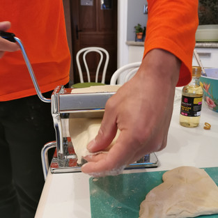 --> Sortez la pâte du frigo ! Si vous avez un laminoir c'est très pratique pour réaliser une pâte fine, sinon, utilisez le traditionnel rouleau. Rouler, Rouler, Rouler jusqu'à l'obtention d'une pâte très fine. Vous devez maintenant faire des cercles : comme des petites "crêpes" : Vous pouvez utiliser un bol :