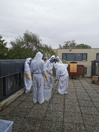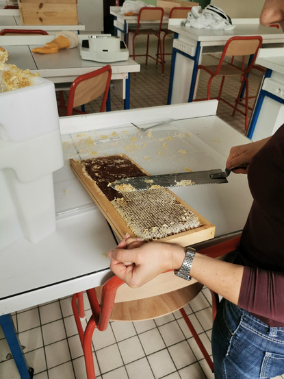 En juillet dernier, la récolte du miel a eu lieu sous la coordination de Mme Dopre et M. Philippe, tous deux professeurs d'SVT.